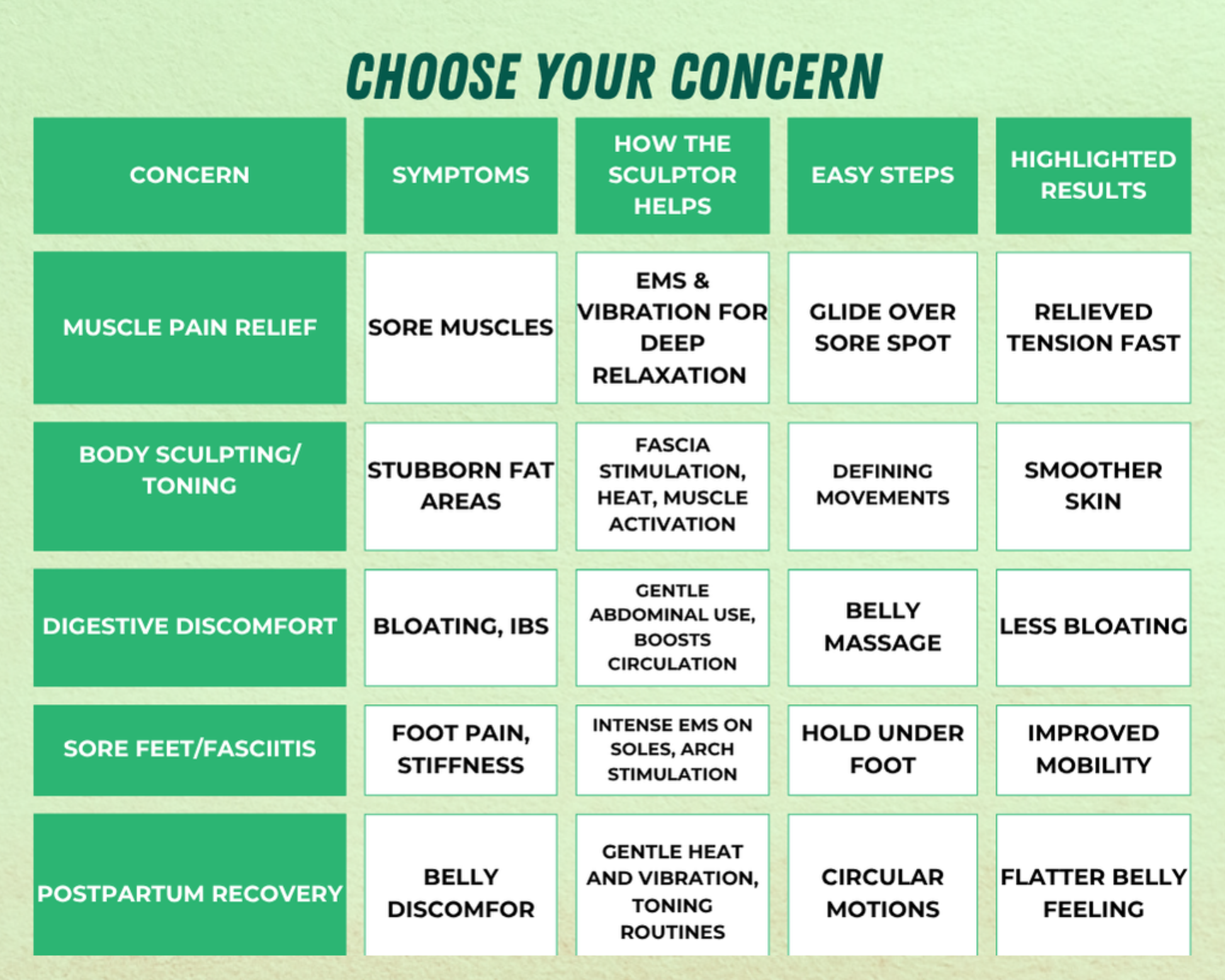 - Tackle problem areas — muscle soreness, plantar fasciitis, bloating caused by IBS, or postpartum belly discomfort